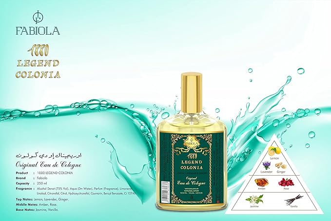 تحتوي كولونيا فابيولا ليجـند 1880 على عطر آسر يجسد الأناقة والسحر. بفضل مزيجها الساحر من روائح الياسمين والفانيليا، تخلق هذه الكولونيا انطباعًا أوليًا لا يقاوم يدوم في الـهواء. يكشف قلب العطر عن تناغم دقيق بين الورد والعـنبر، مما يضيف العمق والجاذبية إلى التركيبة الشاملة. لتنشيط الحواس، تمتزج المكونات العليا للخزامى والزنجبيل والليمون، مما يخلق دفعة منعشة مليئة بالطاقة.