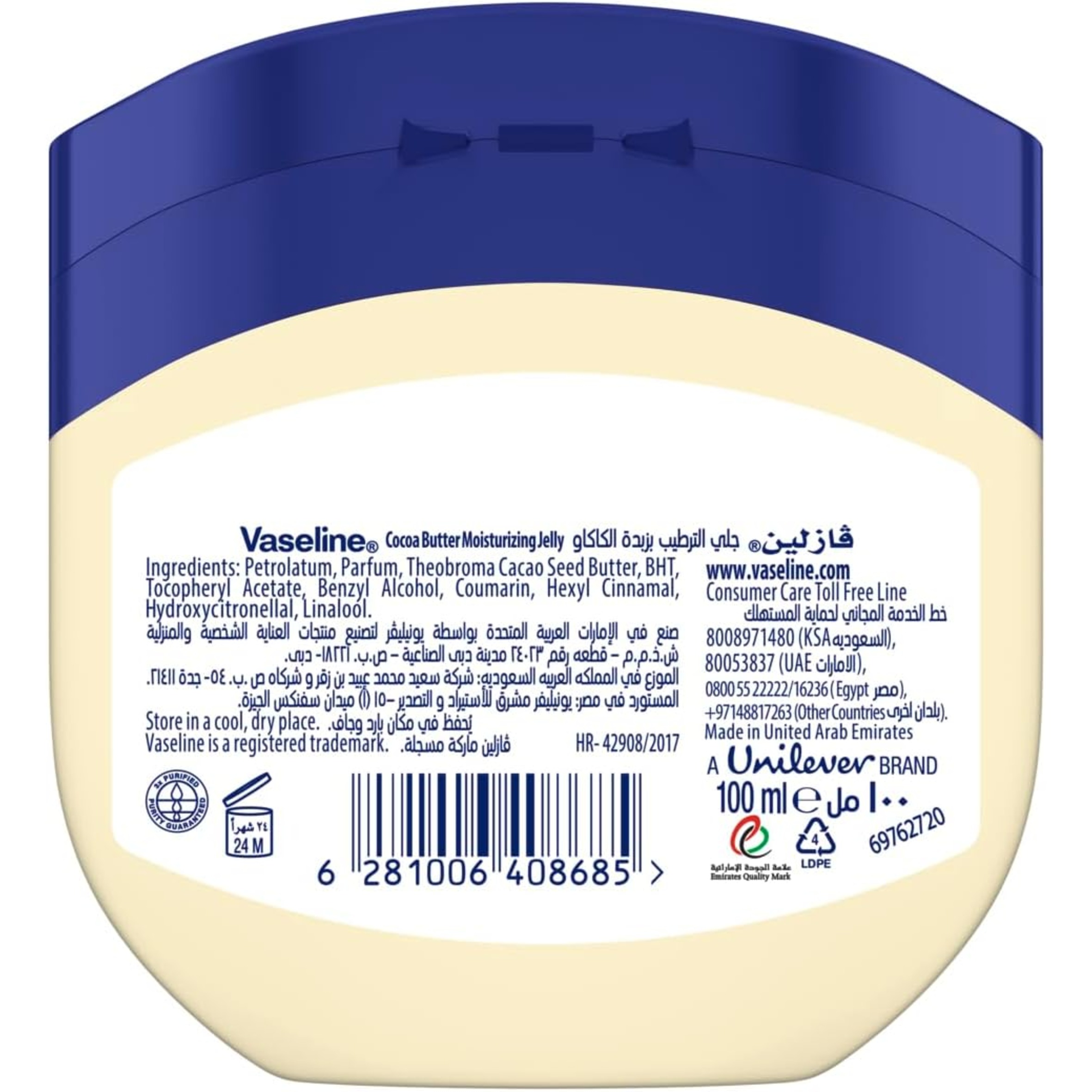 عندما تبدأ بشرتك بالجفاف والتشقق تبدأ الطبقة التي تعمل على حجز الرطوبة بالانهيار بفعل الجفاف وتصبح ضعيفة وتجد صعوبة في إعادة إصلاح نفسها، يعمل هلام الفازلين عن طريق إنشاء طبقة حاجزة مانعة للتسرب بحبس الرطوبة وحماية البشرة، ويدعم عملية التعافي الطبيعية، هذا المنتج مصنوع من الهلام المنقى لثلاث مرات نقي 100٪، الهلام يحتوي على زبدة الكاكاو المعروفة بأنها تغذي البشرة بشكل لطيف ولا بسبب الحساسية على البشرة أو الحبوب، يجعل بشرتك صحية وزاهية طوال اليوم، المكونات:فازلين أبيض ما يصل إلى (99.96٪) وعطر. تحذير قانوني: للاستخدام الخارجي فقط. إذا لامس المنتج العينين، اشطفيها جيدًا بالماء
