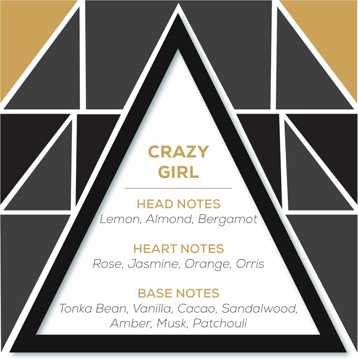 - سبراي معطر بريف كريزي جيرل للنساء 250 مل، الروائح الأولية: حبوب التونكا والفانيلا والكاكاو وخشب الصندل والعنبر والمسك والباتشولي – الروائح الوسطى: الليمون واللوز والبرغاموث – الروائح القاعدية: الورد والياسمين والبرتقال والسوسن. الجنس: للنساء المجلد: 25 0 مل